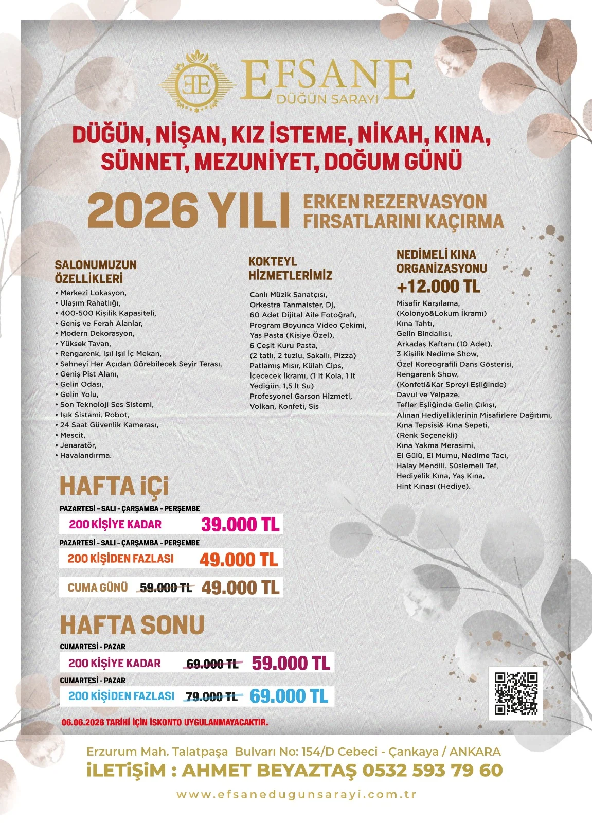 EFSANE DÜĞÜN SARAYI olarak, düğün, nişan, kına ve özel davet organizasyonlarında her detayı titizlikle planlıyor; şıklığı, zarafeti ve konforu bir arada sunuyoruz. Hayalinizdeki daveti, profesyonel ekibimizle gerçeğe dönüştürmek için yanınızdayız.