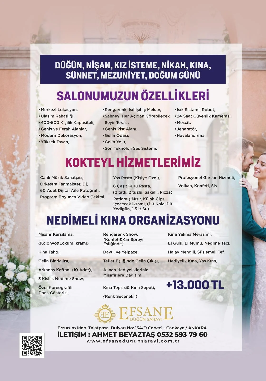 EFSANE DÜĞÜN SARAYI olarak, düğün, nişan, kına ve özel davet organizasyonlarında her detayı titizlikle planlıyor; şıklığı, zarafeti ve konforu bir arada sunuyoruz. Hayalinizdeki daveti, profesyonel ekibimizle gerçeğe dönüştürmek için yanınızdayız.